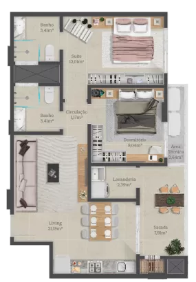 *As imagens, ícones e diferenciais apresentados neste material possuem caráter ilustrativo. Para informações completas sobre características técnicas, acabamentos e condições de entrega, consulte o Memorial Descritivo e o Manual do Proprietário. Ressaltamos que os itens informados podem variar conforme o tipo e a unidade do empreendimento, sendo essencial a verificação das especificações de cada imóvel.